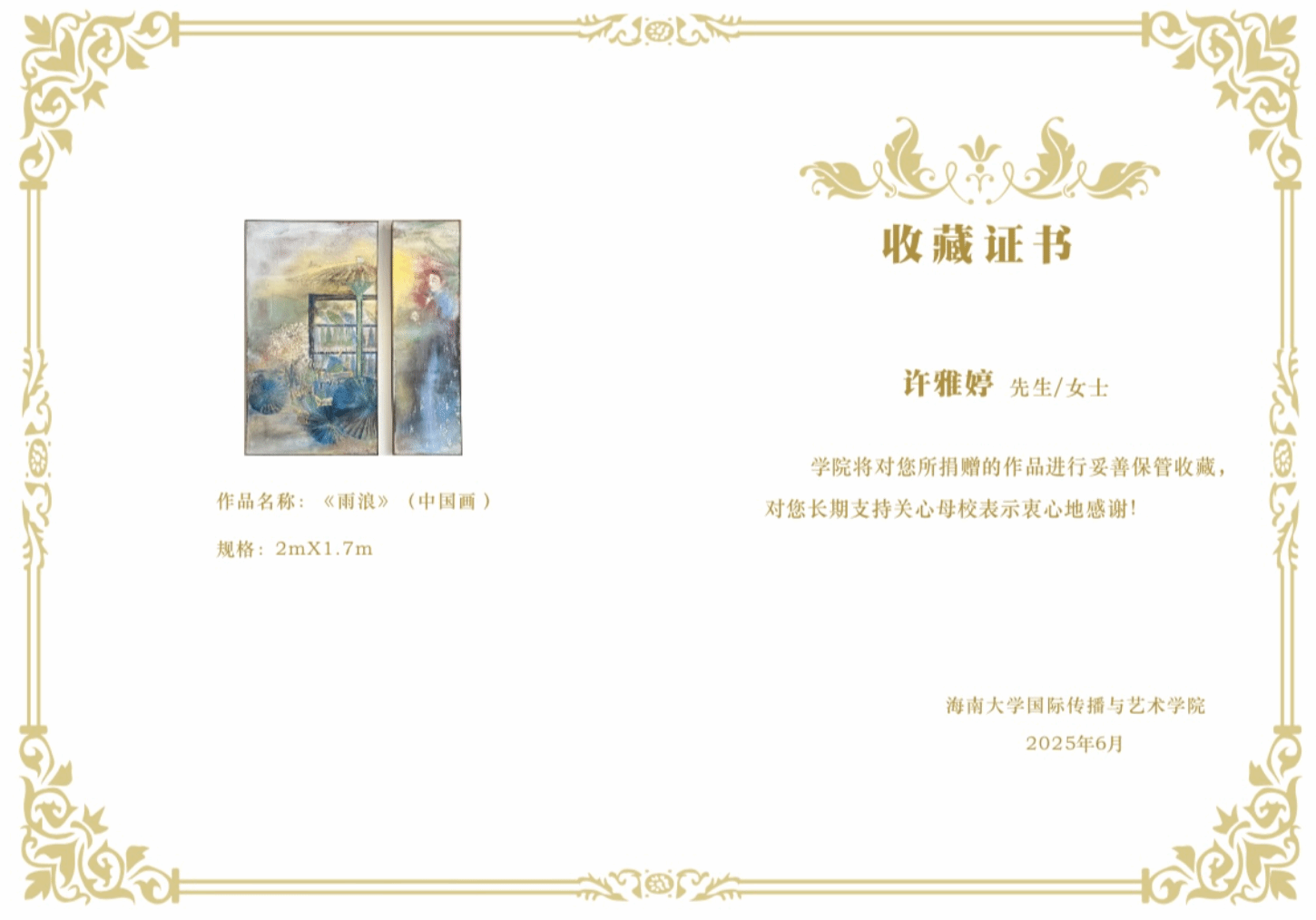 郑立波院长为油画班学生颁发收藏证书