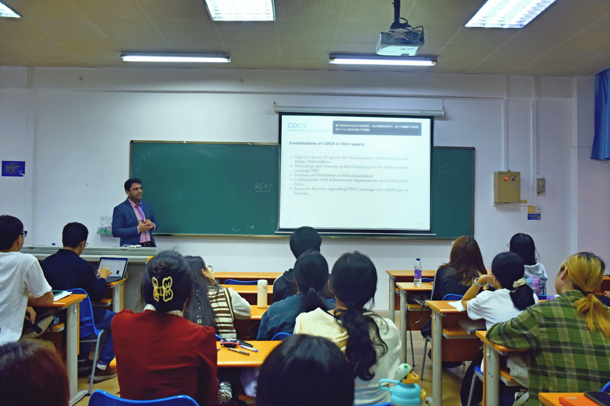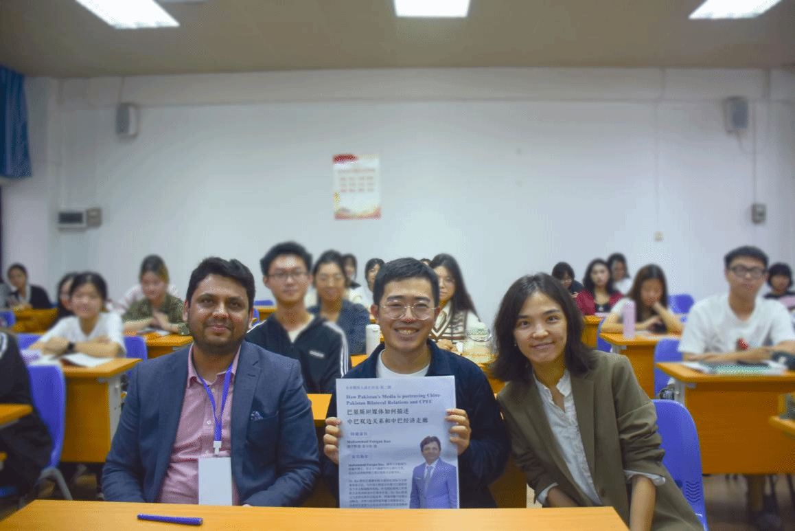 讲座上,富尔坎·饶介绍了中巴友谊的深厚渊源以及巴基斯坦的媒体情况,并以推特为例,重点讲述了巴基斯坦的社交媒体,以论述媒体数字化的盛行之势。他建议同学们学习更多关于社交媒体和数字媒体的知识,以在新的媒体环境下更好地从事国际新闻与传播的相关工作。此外,富尔坎·饶阐述了中巴经济走廊的意义,包括中国对巴基斯坦绿色环保领域的投资极大解决了巴基斯坦的电力问题与能源危机,同时也为中国提供更大的市场。他还分享了巴基斯坦媒体对中巴经济走廊的描述,认为巴基斯坦的多数媒体都以正面和积极的角度报道中国,与中国保持良好关系。