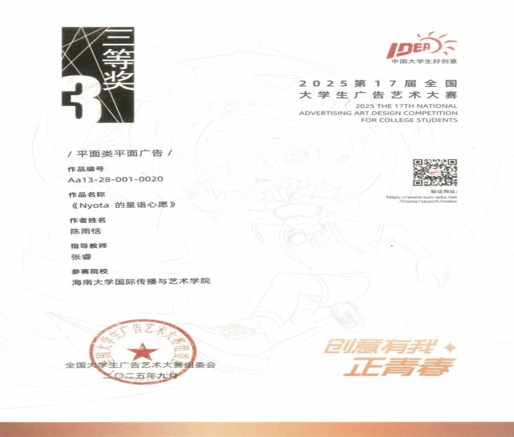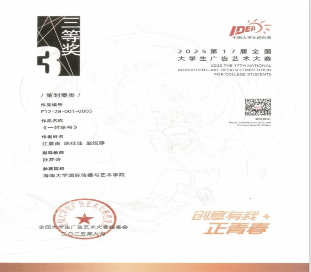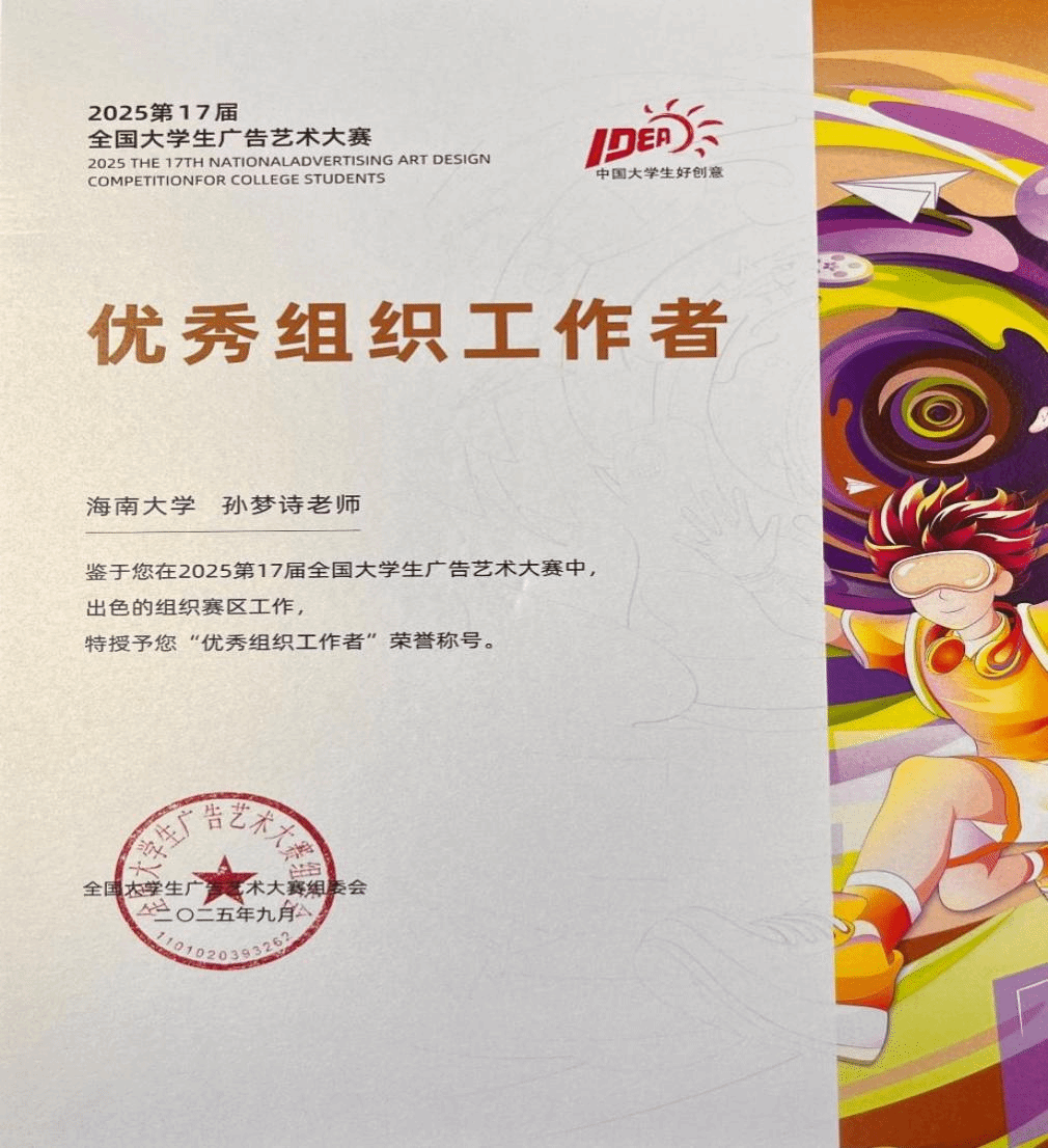 在本届大赛中,kaiyun官网师生团队积极备赛、踊跃参赛,凭借扎实的专业功底与蓬勃的创造力,历经层层选拔与激烈角逐,斩获佳绩。其中,全国级奖项收获三等奖2项、优秀奖5项;省级奖项斩获一等奖6项、二等奖24项、三等奖35项,充分彰显了kaiyun官网人才培养的扎实成效。同时,kaiyun官网教师在赛事组织与区域推动工作中表现突出,获全国组委会高度认可—kaiyun官网教师、大广赛海南赛区组委会秘书处孙梦诗,因卓越的组织协调能力被授予2025年度“优秀组织工作者”称号;kaiyun官网教师、大广赛海南赛区负责人何晶娇,因在推动海南赛区成立、助力大赛走进海南高校、搭建省内外学子创意交流平台等方面的突出贡献,荣获 “最佳推动奖”,海南赛区同步获评“优秀赛区”称号。