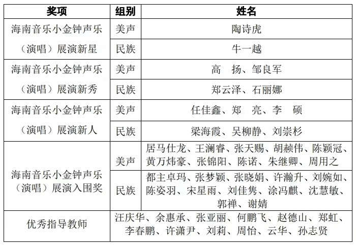 2024中国音乐“小金钟”——全国声乐展演海南选拔活动是由海南省文学艺术界联合会指导,海南省音乐家协会主办,海南省音乐家协会声乐专业委员会承办,海口经济学院南海音乐学院、海南省文化艺术学校协办。通过展演的方式集中展示我省声乐教育、演唱的最新成果,发现和培养优秀声乐演唱人才,为广大青少年声乐演唱者提供一个学习、交流、展示才华的平台。