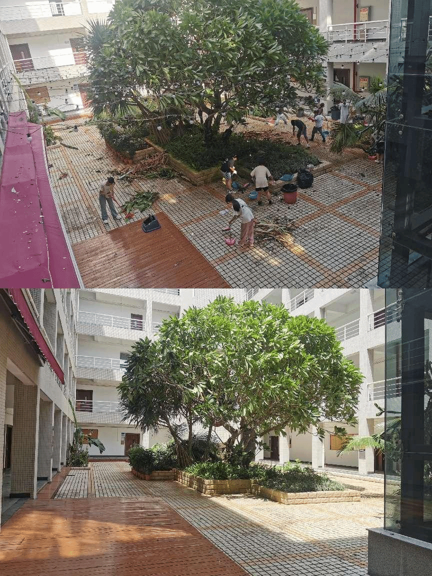 通过几天的努力,田家炳楼和艺术大楼的清障工作已基本完成,周边主干道恢复通畅,消除安全隐患,正逐步恢复整洁有序的校园环境。