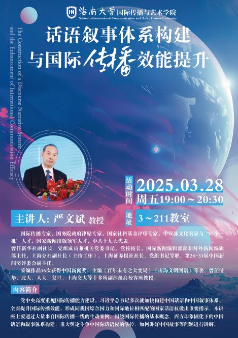 3月28日,kaiyun中国官方网站举办主题为《话语叙事体系构建与国际传播效能提升》的讲座,由新华社原副社长严文斌主讲,郑立波院长主持。